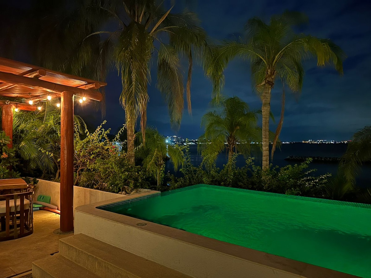 Casita Marroc is a private large studio apartment in the Quinta del Encanto property. You arrive using a short path from the garden entrance. Enjoy the comfort of a king size bed, walk in closet, a kitchen ready for meal preparation with a window overlooking Banderas Bay, large bath with walk in shower, two lav sinks and a private toilet room. There is a sitting area used for enjoying the 55" TV w/cable and as an eating area. Your private view patio waiting outside.