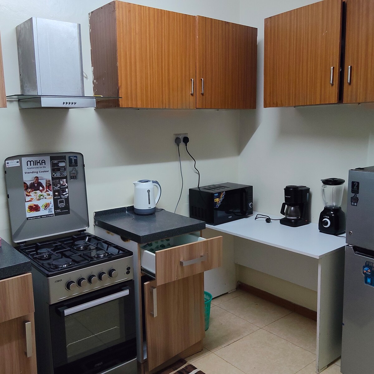 Forget your worries in this spacious and peaceful space. It is a flat of few units and so as a guest, you will experience peace. If you love spaces, this is the unit for you. The has all amenities including a dining which doubles as your working space, huge parking to accommodate any type of vehicle including trucks and the location is Central, some less than 5 mins drive to town and walking distance as well. Its near the tarmac and well secure.