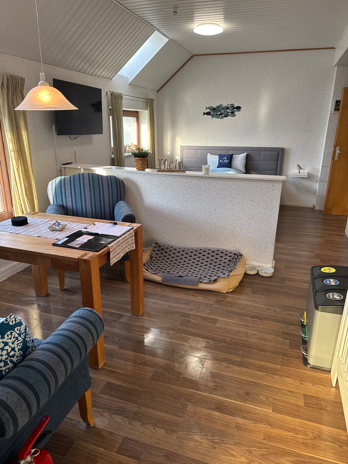 Are you looking for a great vacation on the beautiful peninsula of Butjadingen? Then you have come to the right place. Our small 32 sqm apartment "Plicht" is equipped with a cozy box spring bed. Linens and towels are already provided upon arrival. Our rustic East Frisian sofa is perfect for a real East Frisian tea time and invites you to relax. Swivel TV with Netflix, Amazon, etc. Shower bath Fully equipped kitchenette