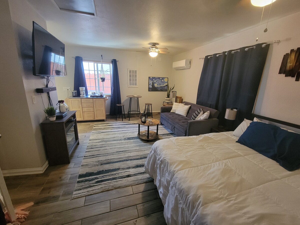 We recently converted our garage into a beautiful studio apartment. We equipped the unit with a 50" flat screen TV, full cable package, bose sound bar/Bluetooth speaker, high speed internet, walk in shower with dual shower heads and a bench seat, full kitchen with gas stove, bedroom with a queen size bed, living room with a pull out sofa, fenced private patio area with fire pit, off street parking 30 ft from the door, and everything you need for a nice quiet night and or weekend getaway. Pets ok