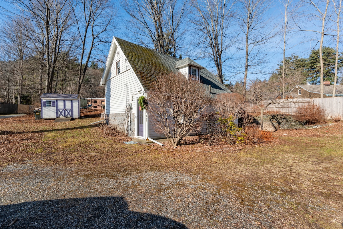 Artsy vintage cottage with a private lodge in a quiet Berkshire neighborhood. Backyard opens to woods with trails nearby. Enjoy fireplaces and hot tub in winter, waterfall and outdoor shower in summer. Upstairs queen ensuite with bathroom and soaking tub; downstairs retro kitchen, living room, and full bath with shower. Lodge offers comfy seating, farm table, and big-screen TV. High-speed internet, Prime & Spectrum TV.
