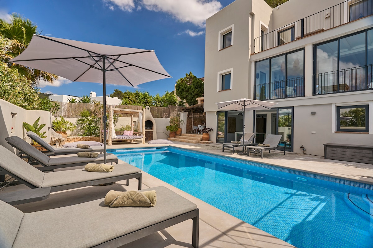 Charming, boutique-style villa nestled in a romantic green garden with old trees & flowers. With its terraces, chillout areas & a lovely little private pool the property offers great space & privacy for 8 to 9 guests. All 4 bedrooms with AC. Internet: high-speed fiber-optic! Within a 6min walk you reach the beautiful sandy beach of Cala Llonga. Restaurants, supermarkets, shops & taxi stand are only a 4min walk away. To Ibiza golf or Santa Eularia it's a 5min drive; to Ibiza Town it takes 12min.