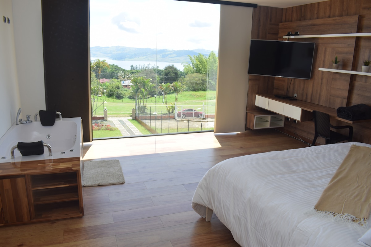 Un refugio exclusivo en medio de la naturaleza, descubre un paraíso de lujo y serenidad en el corazón del lago Calima, con un diseño arquitectónico y elegante la casa combina lujo y funcionalidad. Con vista al Lago Calima al frente y rodeada de montañas. Diseñada para desconectarte del estrés, ofrece una piscina y Jacuzzi privado, habitaciones con camas premium. El lago es conocido por sus actividades acuáticas como kitesurf, paddleboard y paseos en lancha y relájate viendo el atardecer.