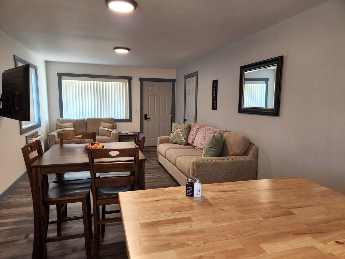 Whether you are looking for a backcountry experience or the slow pace of a small town, you’ll come home to a hot shower and fresh linens, a fully-equipped kitchen and 815 sq ft. of cozy charm. Our goal is to make your stay easy and care-free so you can get out and enjoy your adventures! Wifi, ceiling fans, on-demand water heating and A/C will add comfort and convenience to your stay, along with a heated mudroom for outdoor gear that is equipped with a full-size washer and dryer.