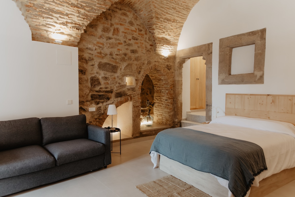 Enjoy Cáceres from our unique little house. In the heart of the Old Town and with the 12th century Almohad Wall as the main façade, it is a privileged haven of peace, equipped with all the necessary comforts to make your stay in Cáceres an unforgettable experience. It has a double bedroom, a full bathroom with a large shower and a living room with a fully equipped kitchen. It has a charming reading corner and laundry room. There is A/C, Wi-Fi, Smart-TV, Smart-WC... and you can access it by car.