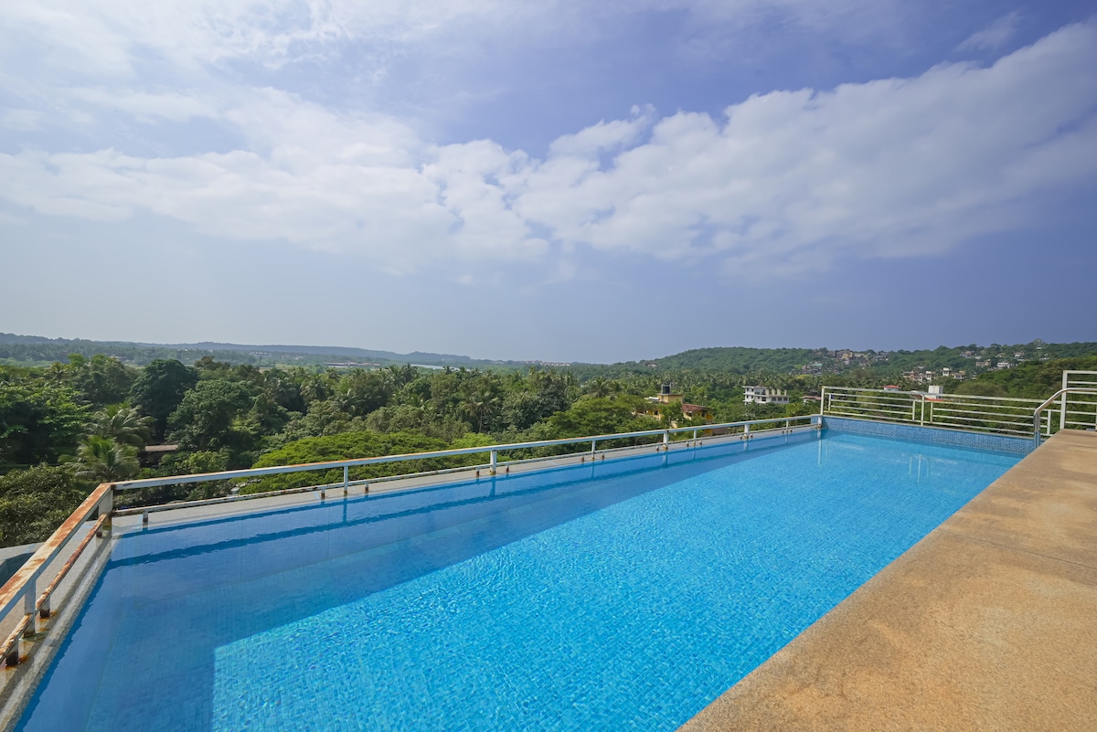 ◆Just 4.4 km from Candolim Beach. ◆Rooftop pool, cosy gazebo & stunning views – perfect for relaxing evenings. ◆Bedroom with elegant interiors & an ensuite bathroom with a jacuzzi bathtub. ◆1-BHK apartment with balcony, perfect for a memorable Goa getaway. ◆Living room with comfy sofas, TV, private balcony & dining area. ◆Enjoy top-notch service from a 5-star hospitality team with the spirit of “Atithi Devo Bhava”