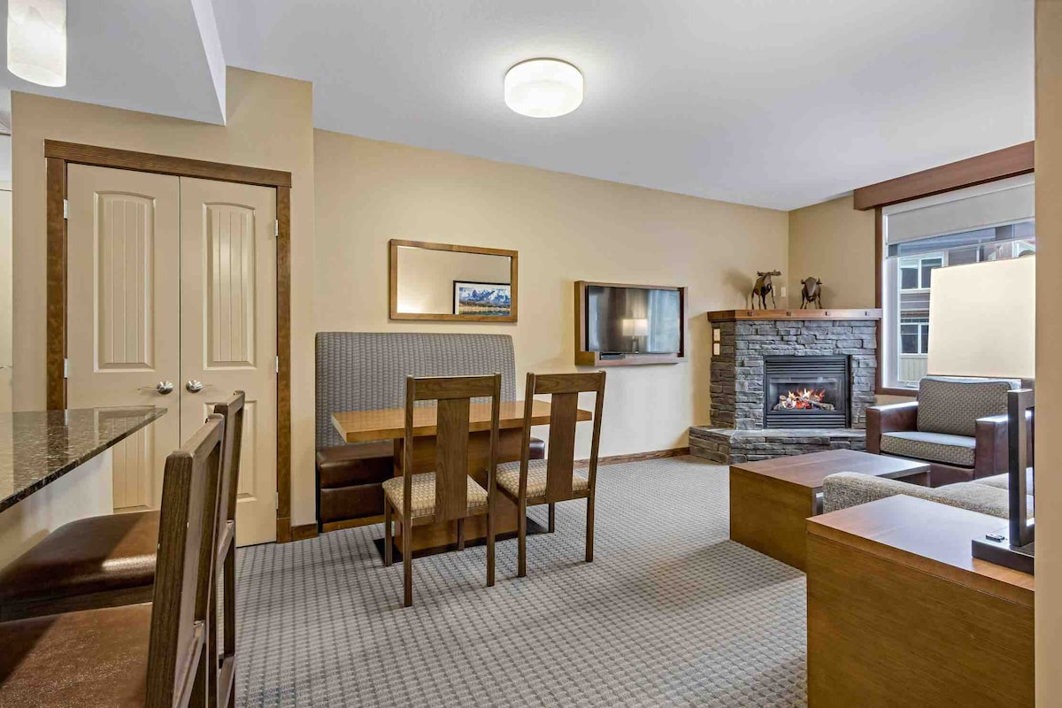 One of the best in Canmore, a luxurious one-bedroom Suite (can sleep 4 people) is in the heart of the Rocky Mountains on the third floor, giving a beautiful view of Three Sisters. Personal High Speed Internet and Complimentary Banff & area season pass. This suite features a full gourmet kitchen, dining & living areas, wine fridge, a washer and dryer, 2 fireplaces, 2 flat screen TVs, spacious private balcony, a spa-inspired bathroom, large windows, heated parking, and free wireless internet.