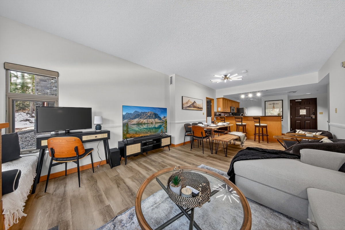 Beautiful mountain getaway! This high-end 2-bed, 2-bath mountain-style condo offers plenty of space for gatherings. Sleeps 6 with a king bed, single-over-double bunk, and pullout sofa, plus 2 full baths. From the balcony, enjoy views of the pool, hot tub, and mountains. Amenities include a year-round heated outdoor pool, hot tub, gym, on-site coffee shop, underground parking, storage, and conference rooms. Pricing is set - No discounts