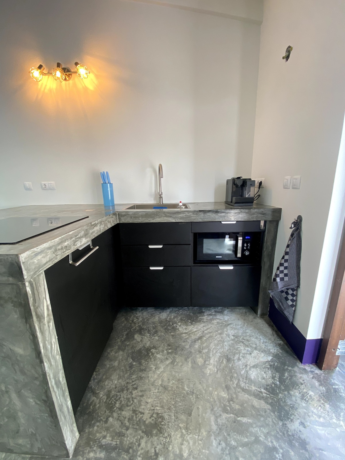 The Woodz Bonaire studio has a lovely veranda with a seat, a box spring bed and a complete bathroom with rain shower with warm water. The kitchenette includes a fridge freezer, Nespresso machine, toaster, egg cooker and kettle. You can rent a 2-burner induction hob for a small fee, which you can do on site. We do not have beach towels, you have to bring your own. To cool down while sleeping, the studio has a ceiling fan and an inverter air conditioning.