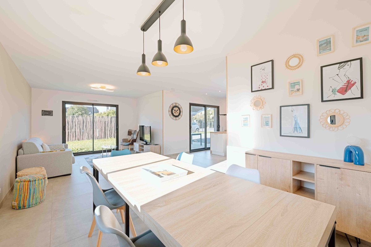 Sensorial Awakening in front of Mont-Saint-Michel. Rated 3 stars and certified Qualidog, this step-free cocoon nestled between sea and countryside offers unobstructed 180° views of the bay. Inside: 2 cozy bedrooms, equipped kitchen, living room with wood burning stove and sofa bed. The veranda floods the space with light, the Bonzini foosball table and the wooded garden invite you to relax. A rare refuge, between elegance, serenity and unforgettable moments - all also accessible to your furry companion.
