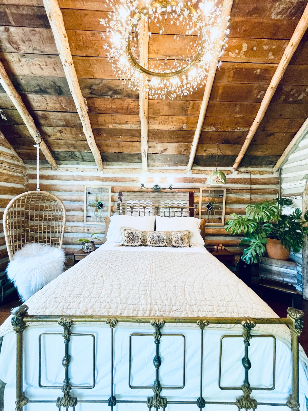 Hot Tub on Back Deck - No Cleaning Fee True Romance is here, experience stunning sunrise views from our most luxurious and spacious one-bedroom authentic log cabin nestled in a Pine tree grove. The cabin features: Cedar walls and vaulted ceilings Large bedroom with big windows and a king-size log bed perfect for stargazing. One full bathroom with a two-person jacuzzi hot tub, Living area with leather sofa, chair, and ottoman Open full kitchen and fireplace Screened deck equipped with hottub