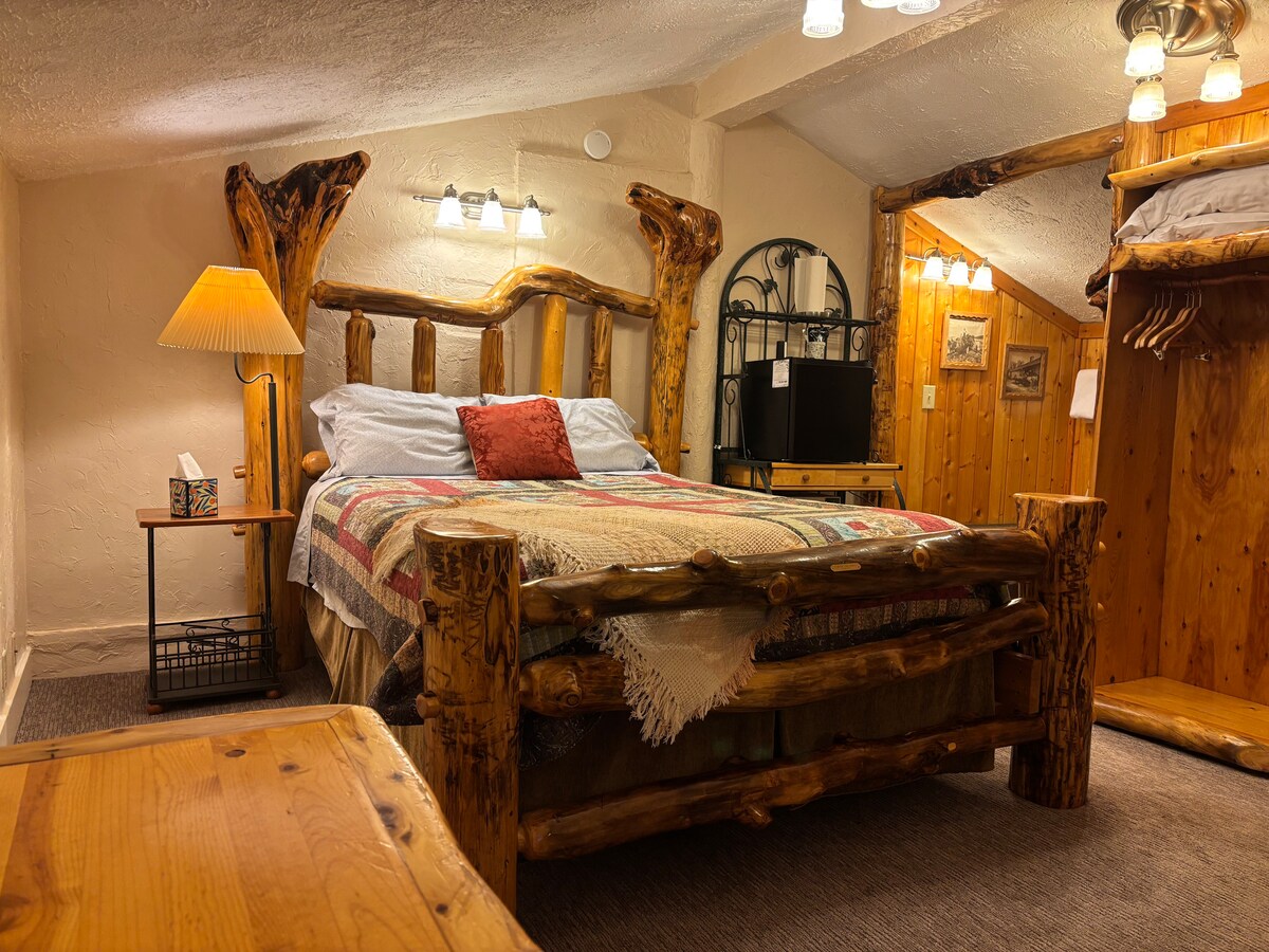 Private entry guest lodge. Community room by the office where a continental breakfast is provided, and is a shared living room for TV, Games, meeting friends, and more. Near Zion, Bryce, Kolob. Custom crafted log bed and matching dresser, large tub/shower. An inviting porch opens to mature trees, birds, wildlife. Enjoy the trails and gardens of this popular event venue. Call to reserve at the Roadhouse BBQ- best brisket and prime rib in town.