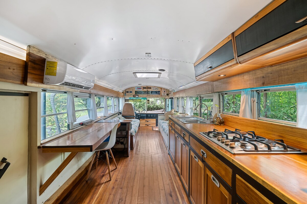 Try something different! This unique accommodation is comprised of a luxury Skoolie and outdoor living room/bathroom. What’s a Skoolie? It’s a renovated school bus converted into comfortable home. Conveniently located in Playa Chiquita with private beach access and nearby restaurants and a grocery store. Amenities include fast fiber optic WiFi, AC, hot water, a queen bed, fully equipped kitchen with a Blendtec blender, full-sized refrigerator and oven, a Bose speaker, and a desk for working.