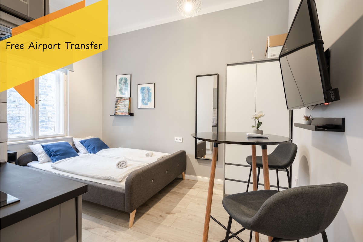 Wake up in a sunny top-floor flat just steps from the Danube, where light floods the rooms and a peaceful, tree-lined street creates the mood. Walk to Parliament in 5 minutes, sip coffee and taste pastries at a cozy café, or unwind on nearby Margaret Island. Set in a beautifully renovated historic building with elevator, the studio offers fast Wi-Fi, A/C, and calm courtyard views, perfect for slow mornings, city exploring,or remote work in Budapest’s vibrant heart. We can’t wait to host you!
