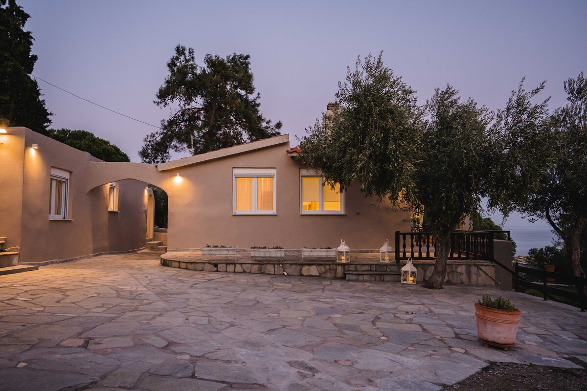 FAMILY FRIENDLY SPACE! The house is located in an absolute privacy peaceful vast courtyard surrounded with trees & grass & offers comfortable living spaces. A wide front sun terrace overlooks the sea accompanied with serene sunsets and cool breezes offered by the rear mountainside. The house is not seaside (850 m from the sea, only in 5 min by car) but surrounded by forest. It is located on the main national road of Halkidiki, which makes it very easily accessible and very safe for any emergency