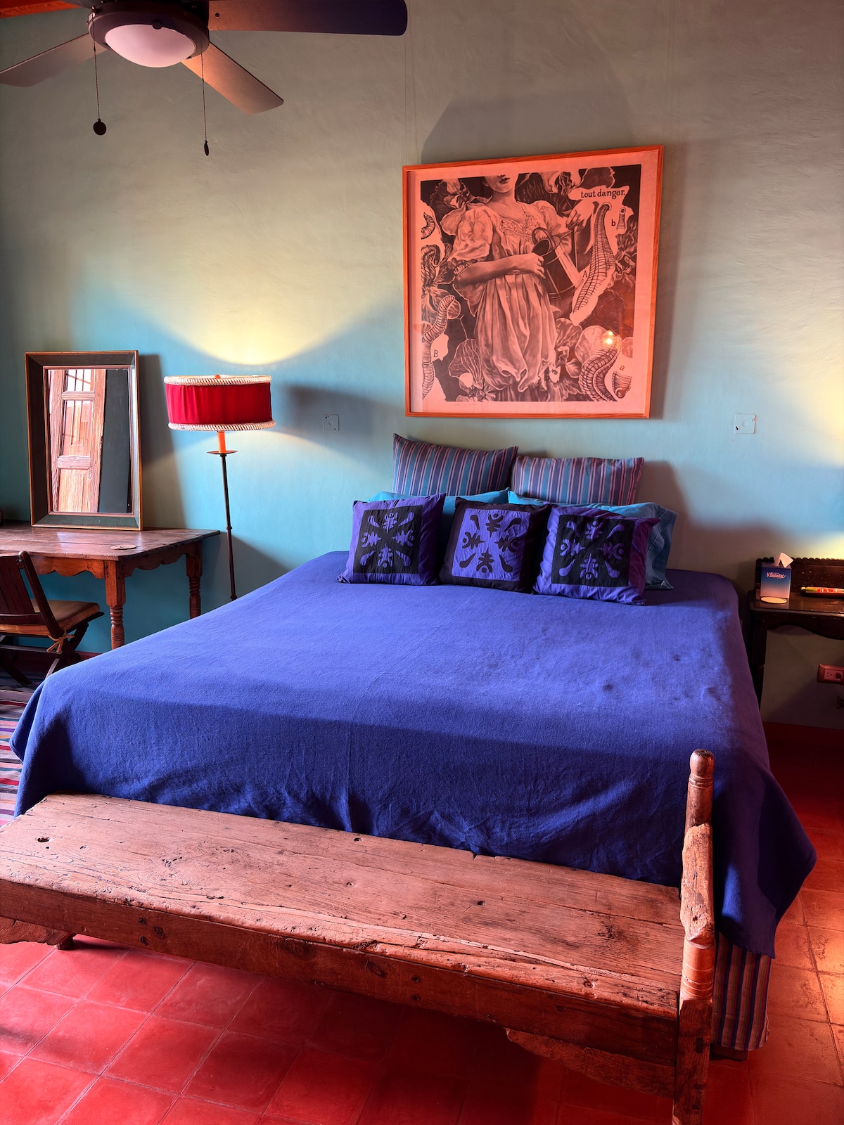 Pensada para grupos, la Habitación #4 ofrece dos camas matrimoniales, baño privado, escritorio y ropero, con vista directa al patio central de la casa. Su amplitud, luz natural y el sonido de la fuente crean un ambiente relajante y armonioso, ideal para descansar después de recorrer las calles coloniales del Centro Histórico.