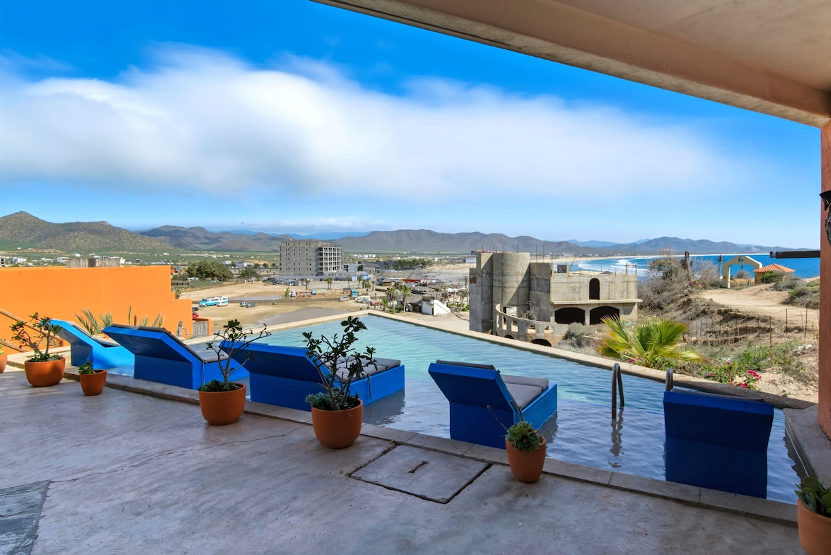 Affectionately known as ‘Dinosaur Eggs’ for its quirky building style, sitting high above a private beach cove, this ancient lookout was a gathering place for families of local fisherman waiting for their loved ones to return from sea. With jaw dropping views of the Pacific, minutes from Todos Santos, world class restaurants and barefoot bars, it sits between the San Pedrito and Cerritos surf breaks. Enjoy epic whale watching from the home’s huge back deck, fire pit and infinity edge pool.