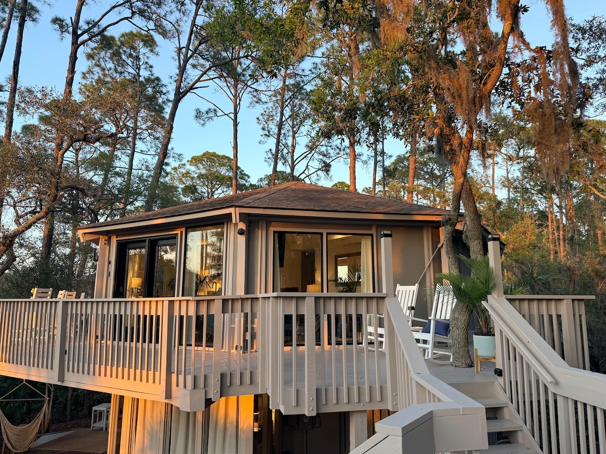 Roxy’s Hideaway — brand new Sea Pines Treehouse, steps from Harbour Town & RBC Heritage! Enjoy exclusive comfort in nature, close to shopping, dining and more. Pet-friendly and ideal for high-end travelers, including pro athletes. Experience unmatched service and bespoke amenities—now including an EV charger. Relax in our hammock throne, surrounded by nature and serene unaugmented ocean views, with pool access at the Harbour Town Pool!