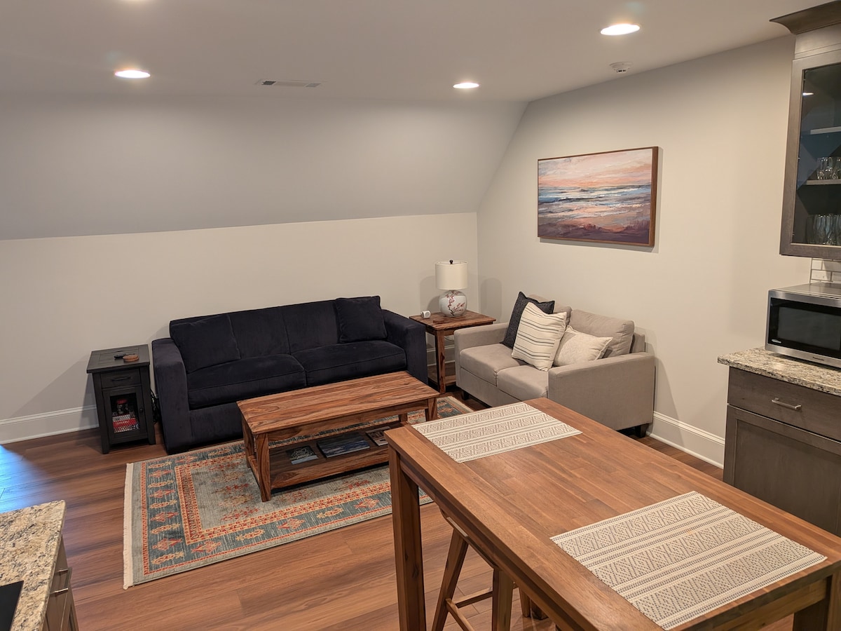 Cozy up at Little Farm at the foothills of the Appalachians. Perfect for couples and traveling professionals, our private walkout basement has a separate driveway and entrance, king size bed and full bath. Comfy reclining loveseat and sofa, 70” HD smart TV with sound bar with Netflix and Amazon Prime, WIFI, refrigerator, microwave, coffee bar with Keurig Coffee Maker, and bistro table. Outside enjoy the Little Farm views of our flock under gorgeous Magnolia complete with fire pit and glider.