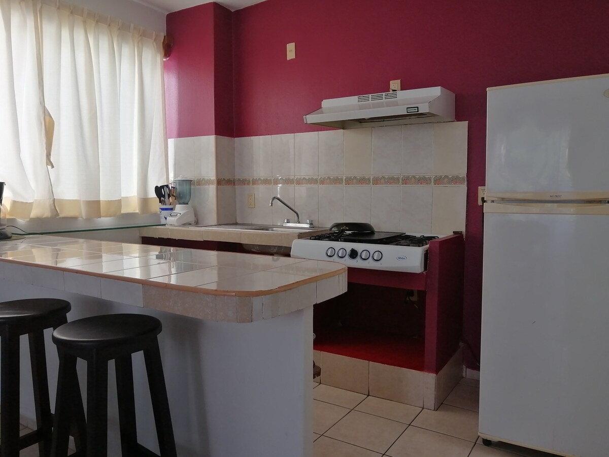 Beautiful spacious and bright apartment just a 5-minute walk from the ADO bus station, Chedraui, Telcel, La Cañada and other commercial areas and 12 minutes from the Central Park. Transportation stops to the ruins are located next to the ADO. In front of the apartment you will find a grocery store. The neighborhood is quiet and safe, so you can park your vehicle on the street without worrying. Very clean, sanitized, antibacterial gel included. We invoice!!