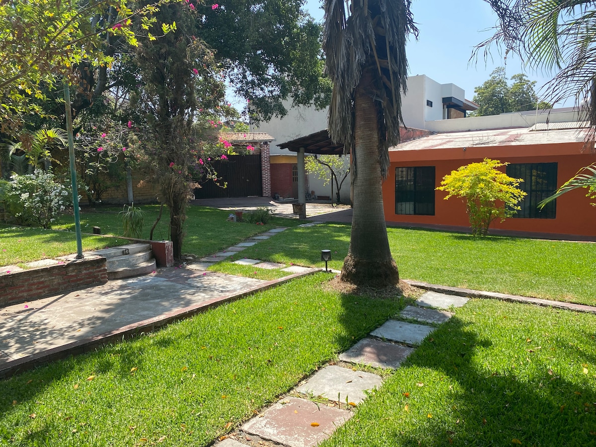 Beautiful private house with everything you need to have a great weekend in a family atmosphere. 15 minutes from Cuernavaca. In the private area there is a 60 m2 garden, dining room, kitchen, refrigerator, fans, cable TV and two bedrooms. In common areas, a large pool with a splash pad, palapa, barbecue and extensive gardens, as well as an illuminated fountain. Parking for 1 car. Cable TV and Wi-Fi service. Parties are not allowed.
