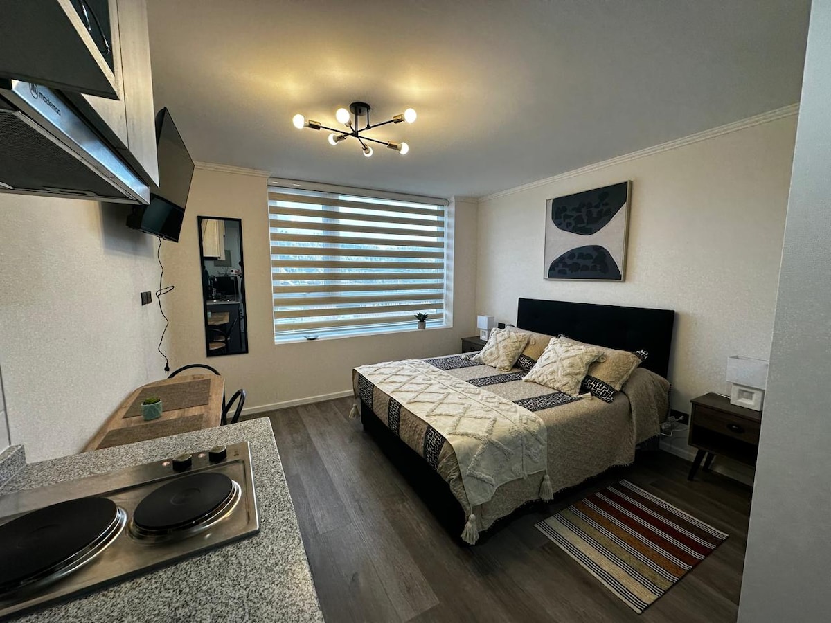 Disfruta de este alojamiento tranquilo y céntrico a una cuadra y media de la plaza de Concepción. Un departamento nuevo, tipo estudio, con una cama de 2 plazas, cocina completamente equipada, baño, estanterías, wifi y cable. El edificio además cuenta con estacionamiento, gimnasio, sala de reuniones, y lavandería.