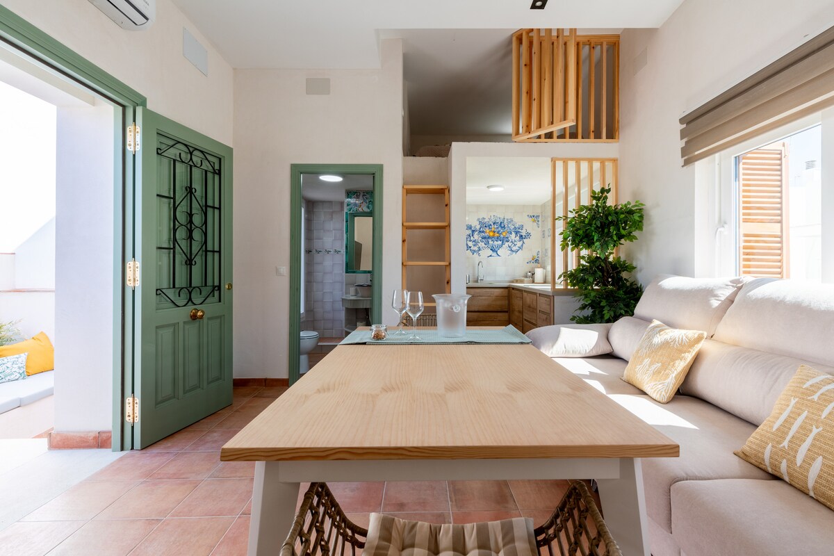 “New apartment in the heart of Calle Ancha, ideal for enjoying Sanlúcar in comfort. Bright, cozy and with a large terrace where you can relax after a day at the beach or tapas in the historic center. Equipped with air conditioning, a sofa bed, and everything you need for your stay. Perfect for couples. The sofa bed is a perfect place for a child. An ideal place if you're looking for comfort, a prime location, and a special corner in the city.”