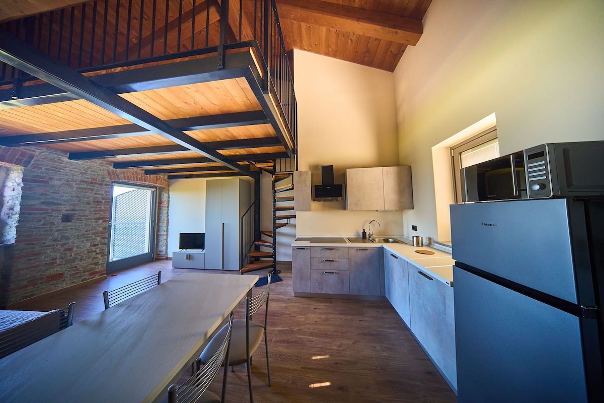With a breathtaking view of the Langhe, the suite Piazza d'Assi is a uniquely designed apartment on the top floor of Palazzo d'Assi, a medieval building in the historic center of Monforte d'Alba. For couples, families, or friends, Piazza d'Assi is a spacious apartment with a living kitchen, a romantic double bedroom, a double bedroom plus a single bed, and a bathroom with a rustic and refined design. Covered terrace. Restaurants, bars, leisure activities within walking distance.