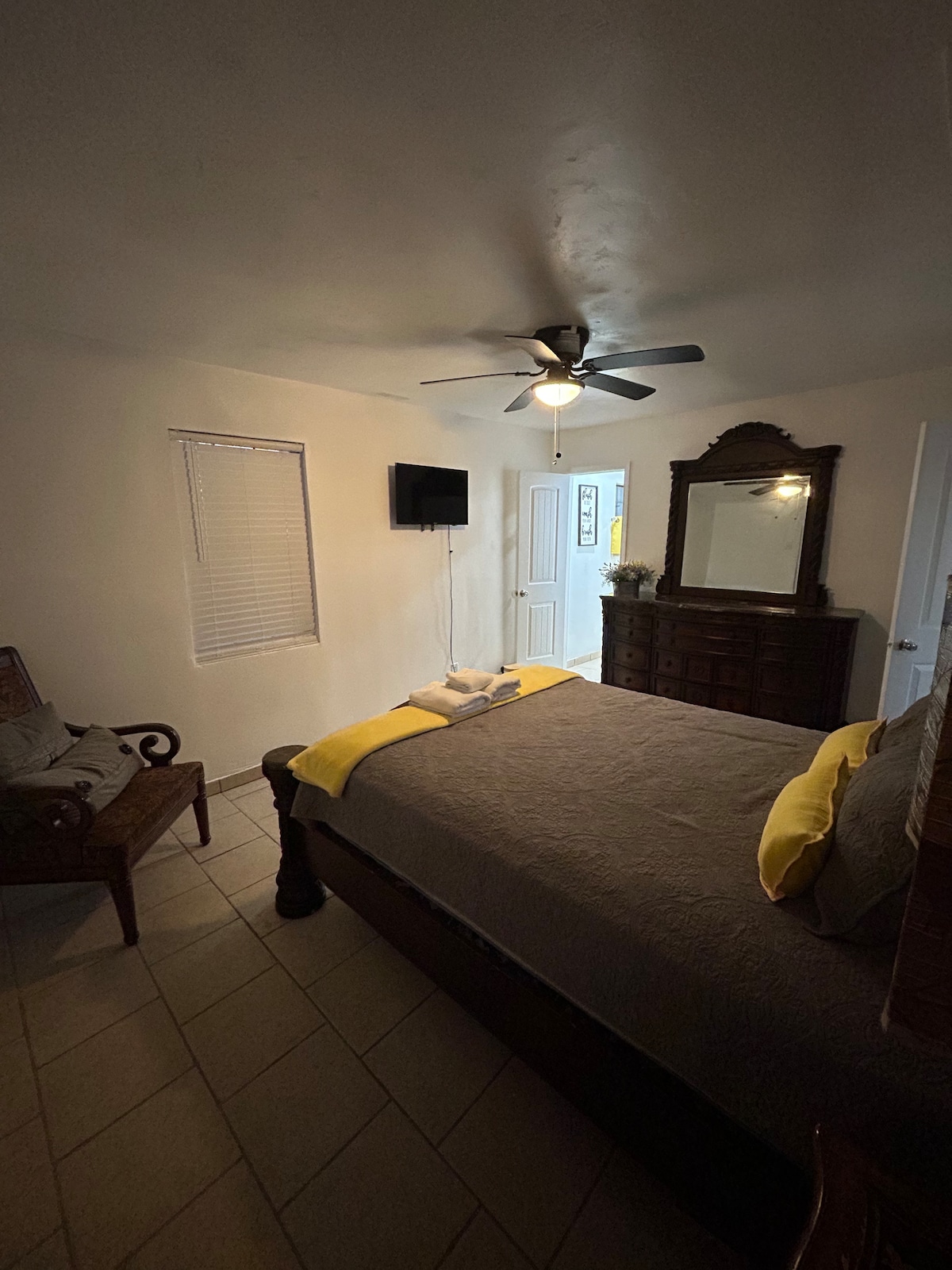 Mid-century retro charm. Fully stocked w/anything u might need. Just bring your clothes! Heat & a/c. Street parking w/security cameras. Qn-size PURPLE mattress. Pack n Play avl upon REQUEST ($15 fee) Fridge, microwave, toaster, toaster oven, 2 burner elect cooktop, ice maker, coffee/tea station, Smart TV Iron & board, hangers, luggage rack, box fan. Table & chairs make a great work station Ext security cameras monitor front of main house (incl street where u will park) & front door of studio)