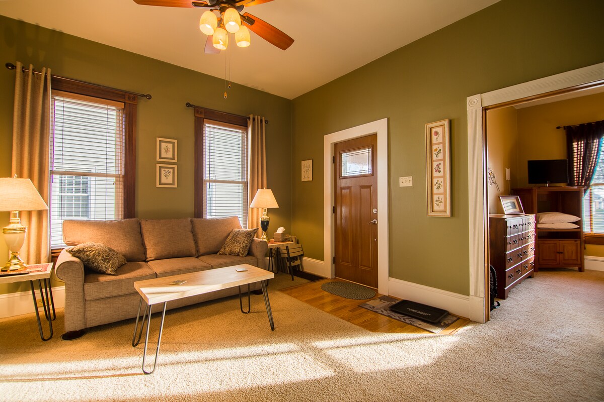 Enjoy your stay at the historic "Bly House". This 3 bedroom, 1.5 bath, 2 story house has a great front porch, leaded glass windows, built in cabinets and a beautiful oak foyer/staircase. Built in 1890 this antebellum styled home sits in a quiet neighborhood with many historic houses and numerous perennials. Centrally located to parks, bike path, beautiful downtown and Mississippi River.