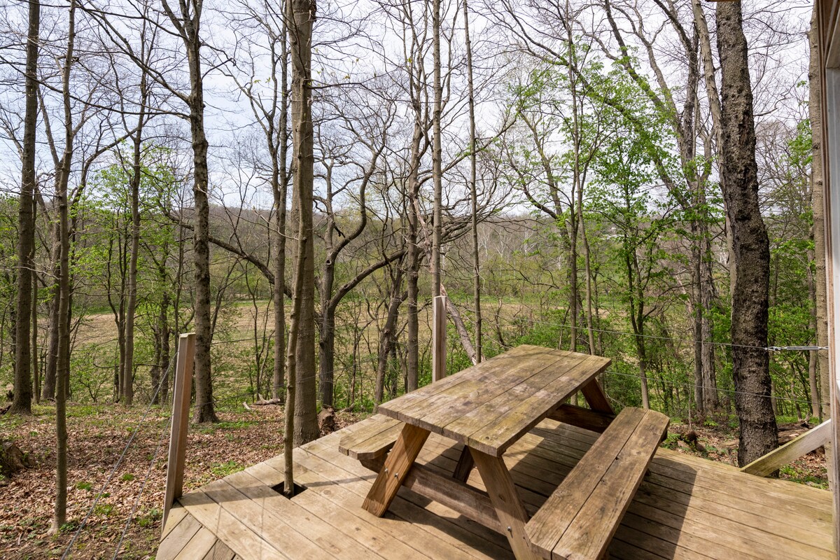 WE ARE ON WINTER BREAK - CLOSED UNTIL MARCH 2026. "Ginseng House" - Our premiere off-grid tiny house! A hand-crafted work of art using our own sawmill lumber. Beautiful wooded setting surrounded by 180 acres of private land and two miles of beautiful Buffalo Creek to enjoy. One comfortable 12" queen in the loft and a fold out double bed love seat on the main floor. Extra guests may pitch tents for $10/night/person. Pets welcome - $35/pet - see pet policy.