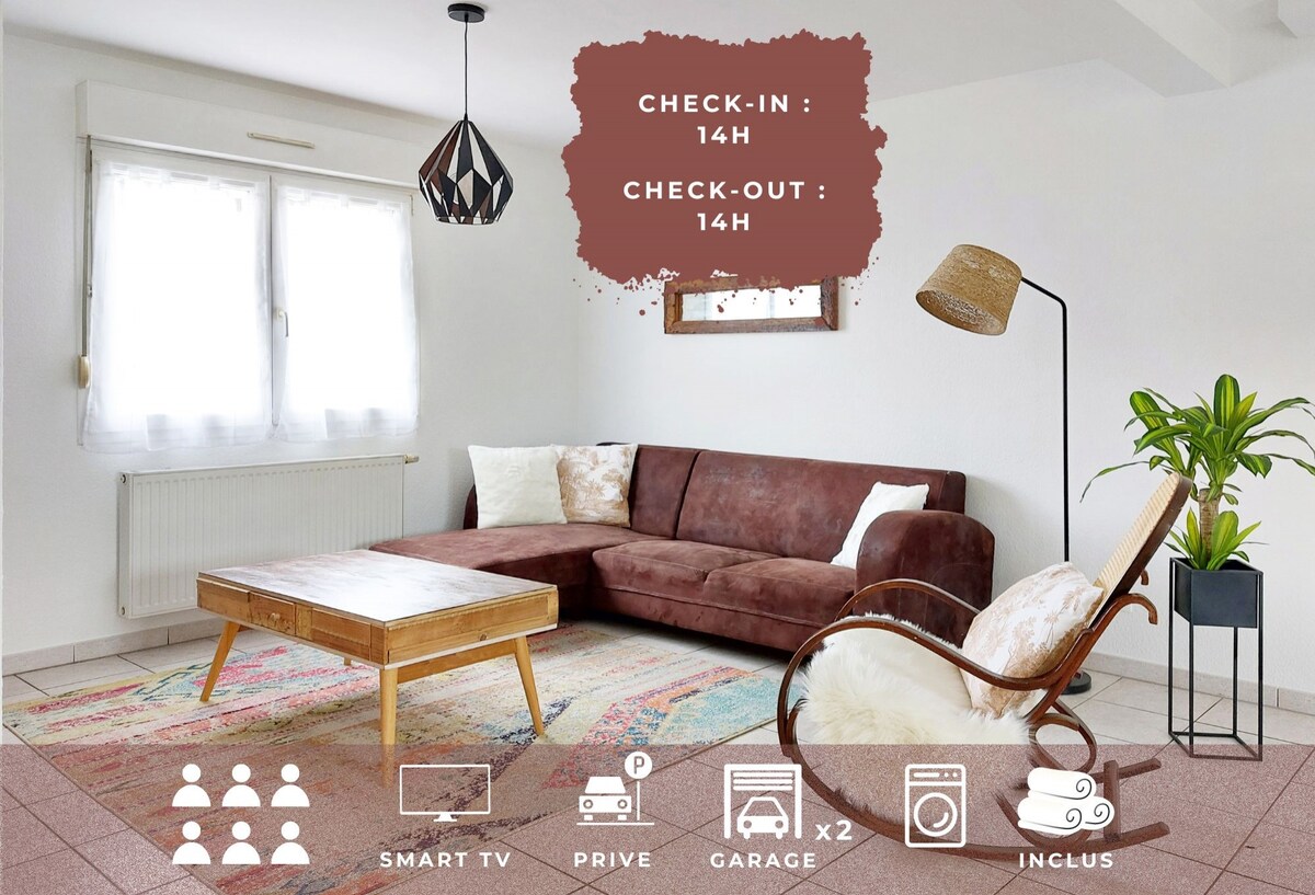 Découvrez cette magnifique maison spacieuse de 120m² avec terrasse, nichée au cœur des charmants villages alsaciens, à 5 km de Colmar. Conçue pour accueillir confortablement jusqu'à 6 personnes, elle est idéale pour des moments en famille ou entre amis. La maison offre 3 grandes chambres élégantes, chacune avec 2 lits simples, un séjour lumineux et une cuisine séparée, entièrement équipée. Pour vos véhicules, un garage double avec porte motorisée et une place de parking vous sont réservés. De