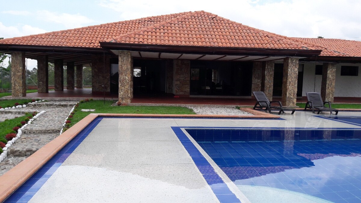 ENJOY WITH YOUR FAMILY AND FRIENDS THE COUNTRY HOUSE LA BENDITA LOCATED IN THE COFFEE REGION. SLEEPS 14 PEOPLE, 5 BEDROOMS (3 WITH DOUBLE BED AND 2 WITH BUNK BEDS), POOL FOR ADULTS AND CHILDREN, BBQ, GREEN AREAS, CORRIDORS, PARKING AREA, WELL-EQUIPPED KITCHEN, DIRECTV. IN LA BENDITA YOU CAN ENJOY THE BEST WEATHER, A WONDERFUL VIEW AND THE TRANQUILITY THAT CHARACTERIZES THE COFFEE AXIS. LA BENDITA IS VERY CLOSE TO PARQUE DEL CAFÉ, LOS ARRIEROS, PANACA, FILANDIA, QUIMBAYA.