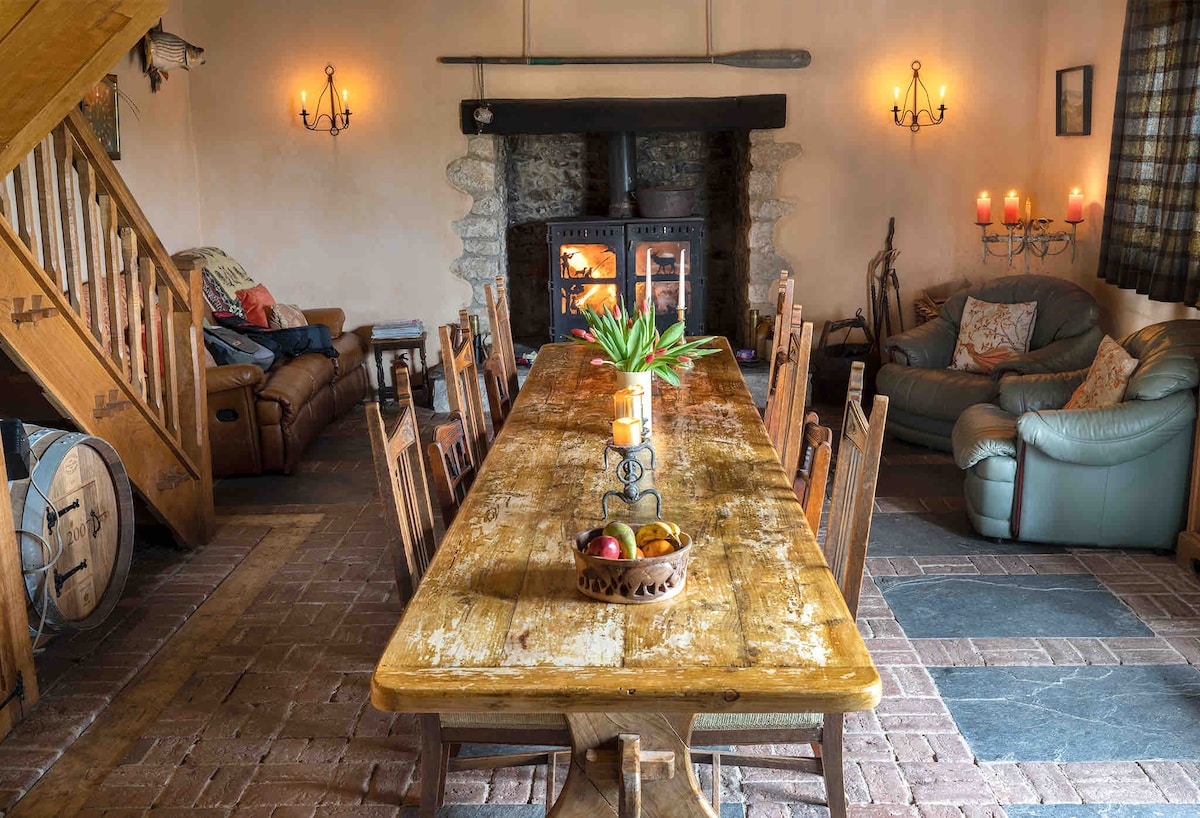 A calm, deeply luxurious space to recharge & reconnect. The Shippon is a meticulously converted cow barn with heated, polished concrete floors, gently curving deep green walls, hand-built kitchen, warmly lit reading nooks, & natural materials. Woollen blankets, feather sofa, antique Scandinavian log burner, king-size bed with French linen & down, waterfall shower, & the softest towels. Our sleepy Devon hamlet is only lit by stars at night. You might just sleep better than you have in years.