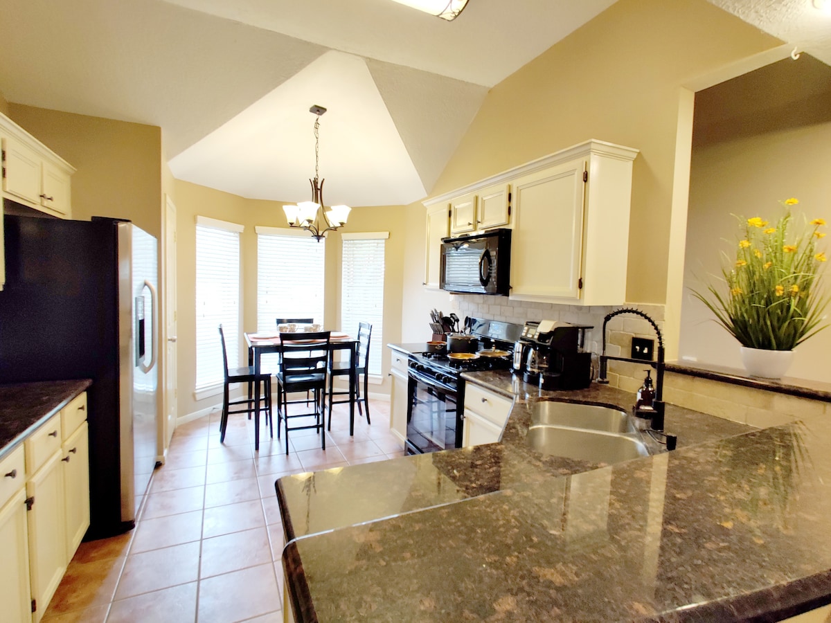 · Located in the quiet, safe neighborhood of Imperial Oaks, 3 miles from The Woodlands · On a cul-de-sac with a private pool, pool and hot-tub · 5 Bedroom, 2.5 Bathroom house recently renovated · 3 king beds, bunk bed and rollaway bed if you want to convert office back into 5th room. · 75" 4K TV and 4K TVs in every bedroom · Fully stocked kitchen · 3 workspaces with ergonomic chairs · Private backyard with mature trees, outdoor dining area, and a fire pit · Pet-friendly (with a fee)
