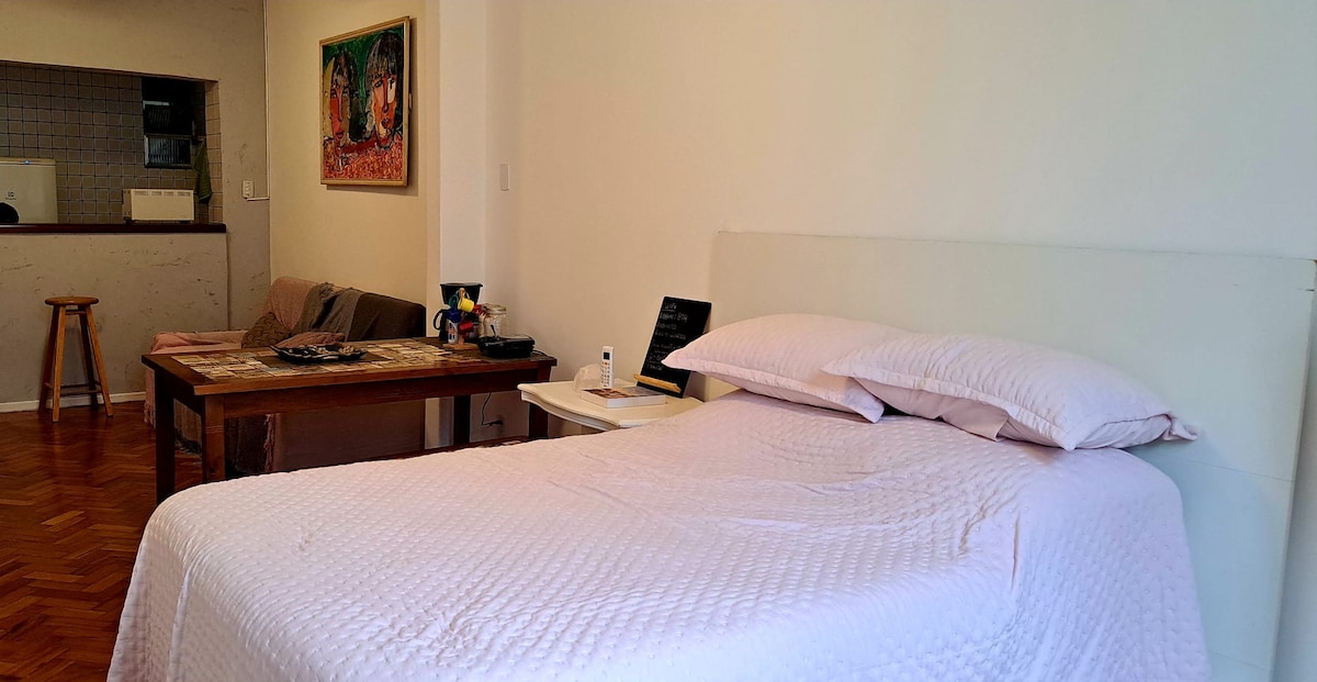 Boho chic style apartment, on the Copacabana beach! - Queen bed, sofa bed, dining table, air conditioning and space for home office (Wifi 300Mbps). Kitchen with stove, refrigerator, oven, microwave, blender, coffee maker, juicer, sandwich maker, pans, kitchen utensils, various books, guitar and TV with apps. - Market and pharmacy under the building, restaurants and shops around the apartment. - Airport at 8.3km - Cristo Redentor at 11.5km - Pão de Açúcar at 2.8km