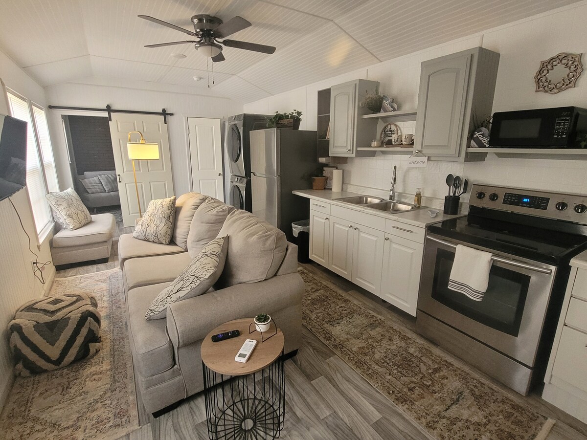 The Cuddly Cow features a full kitchen with laundry, eating bar and dining area. There is one large bedroom with a king size bed. The room has a slider out to the front with table and chairs to have a peaceful enjoyment of nature. Full size bathroom with shower over tub and dual sinks. There is a pool next to this cabin that is not useable for guests due to insurance limitations. We have 3 addt'l cabins on the property, Velvet Rooster, Happy Hound & Pampered Peacock.