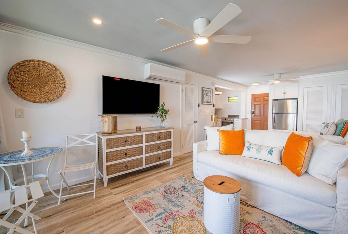 Kick back and relax in this calm, stylish space. This completely remodeled actual 1 bedroom is beautiful! The views are absolutely amazing. This corner unit has a full kitchen with a full size stove, full size refrigerator, dishwasher, and microwave. The bedroom has a brand new queen size bed with your own tv. The bathroom is completely redone. Just steps from the newly remodeled pool and one of my favorite restaurants on the island. Sudi’s. The crystal clear beach is just a short walk.