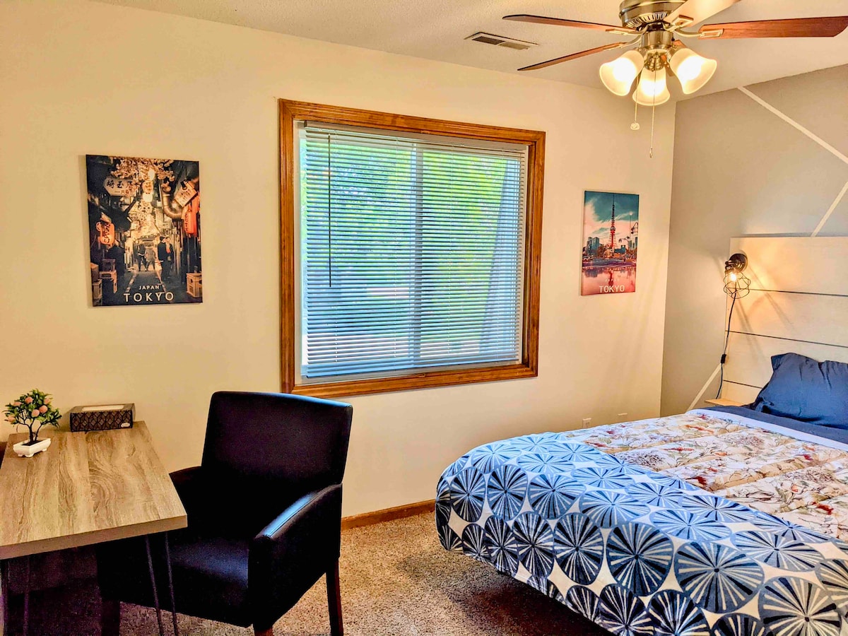 A freshly remodeled suite nestled in Omaha’s heart, this private-entry bedroom offers all the essentials in a compact, comfortable space perfect for two. Private entrance Smart 50″ TV with Amazon Prime for streaming Two-person dining table Compact microwave and mini-fridge (NO FULL KITCHEN OR SINK) private bathroom with a walk-in shower (no bathtub) Nebraska Medical Center (UNMC): ~2.5 mi away CHI Health Immanuel Medical Center: ~ 4.3 mi Children’s Hospital: ~2.9 mi Henry Doorly Zoo: ~7.7 mi
