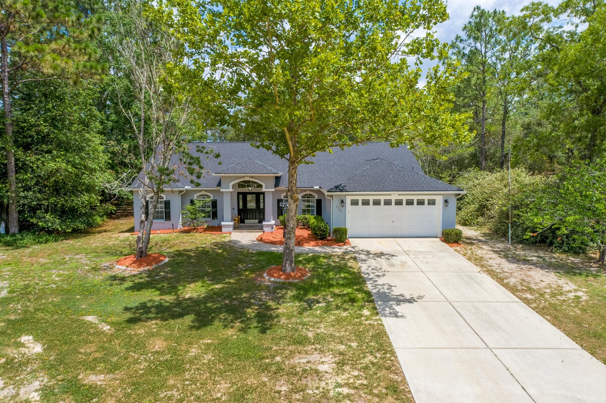 Your private retreat on an acre nestled on a canal to the Withlacoochee River, wrapping around 2 sides of the property. Relax on your porch overlooking the water as you watch the birds and deer play. Kids will love the tire swing, toys such as Lego, Lincoln logs, pool table and ski ball. Kayaks available to our guests awaiting adventure. Bond around the fire pit, walk the trails, lounge in the hammocks, and fish on the dock. Setup the big screen to watch a movie. Welcome to your get-a-way!
