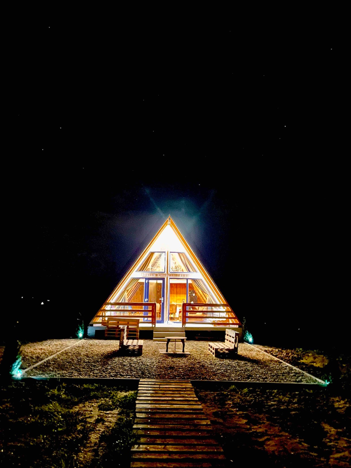 Disconnect from the world and background noise, in a place full of history, color and nature. The AFrame-style house will be all yours, the courtyard and the 3000 sqm orchard all yours, and sometimes you can share them with deer. The house has an open space living room of 50 sqm, a bedroom upstairs, a bathroom with hot water, a fully equipped kitchen and generous glazed surfaces to see the sky at night. If you still want technology, you will have AC with artificial intelligence, SmartTV, Starlink in/out Wifi internet, XBox…