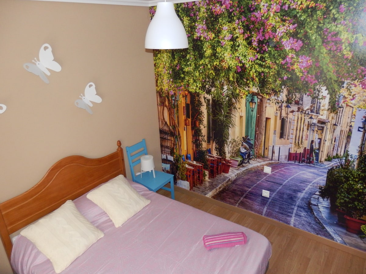 Apartamento de 90 metros, salon con chimenea, habitación de matrimonio con cuarto de baño, cocina totalmente equipada, sala de juegos gratuita con billar, play con pantalla gigante, diana electronica. Patio con barbacoa. Aparcamiento gratuito en la misma puerta de la casa.