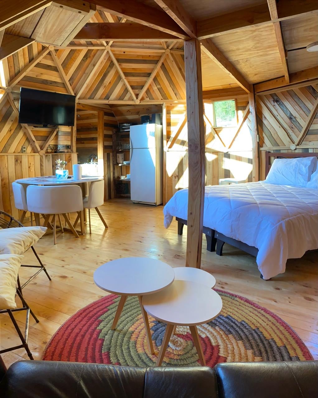 Escape with your partner to a geodesic dome in the middle of the mountain range, surrounded by forests, birds and a starry sky that invites love. With a double bed and private bathroom, you can enjoy an intimate and cozy experience. Immerse yourself in the jar under the stars (additional cost) and experience a magical night of connection and relaxation. Very close to Melipeuco and the imposing Sollipulli volcano, a perfect corner to fall in love and disconnect from the world. *If you like a Tour, we also manage it.