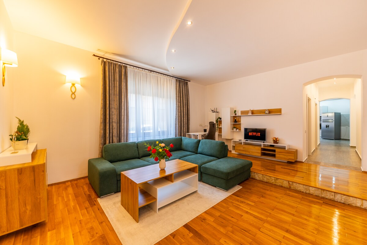 The apartment is located in the city center, in an excellent area, just 2 minutes from the Theatre, restaurants, pubs or park. SkyView consists of two bedrooms with queen size beds, two bathrooms, a spacious living room with smart TV and a fully equipped kitchen. From the bedroom or bathroom, guests can look directly at the sky through the Velux windows. SkyView is designed to provide a comfortable space for couples, families or business travelers who are looking for a memorable stay in Arad.
