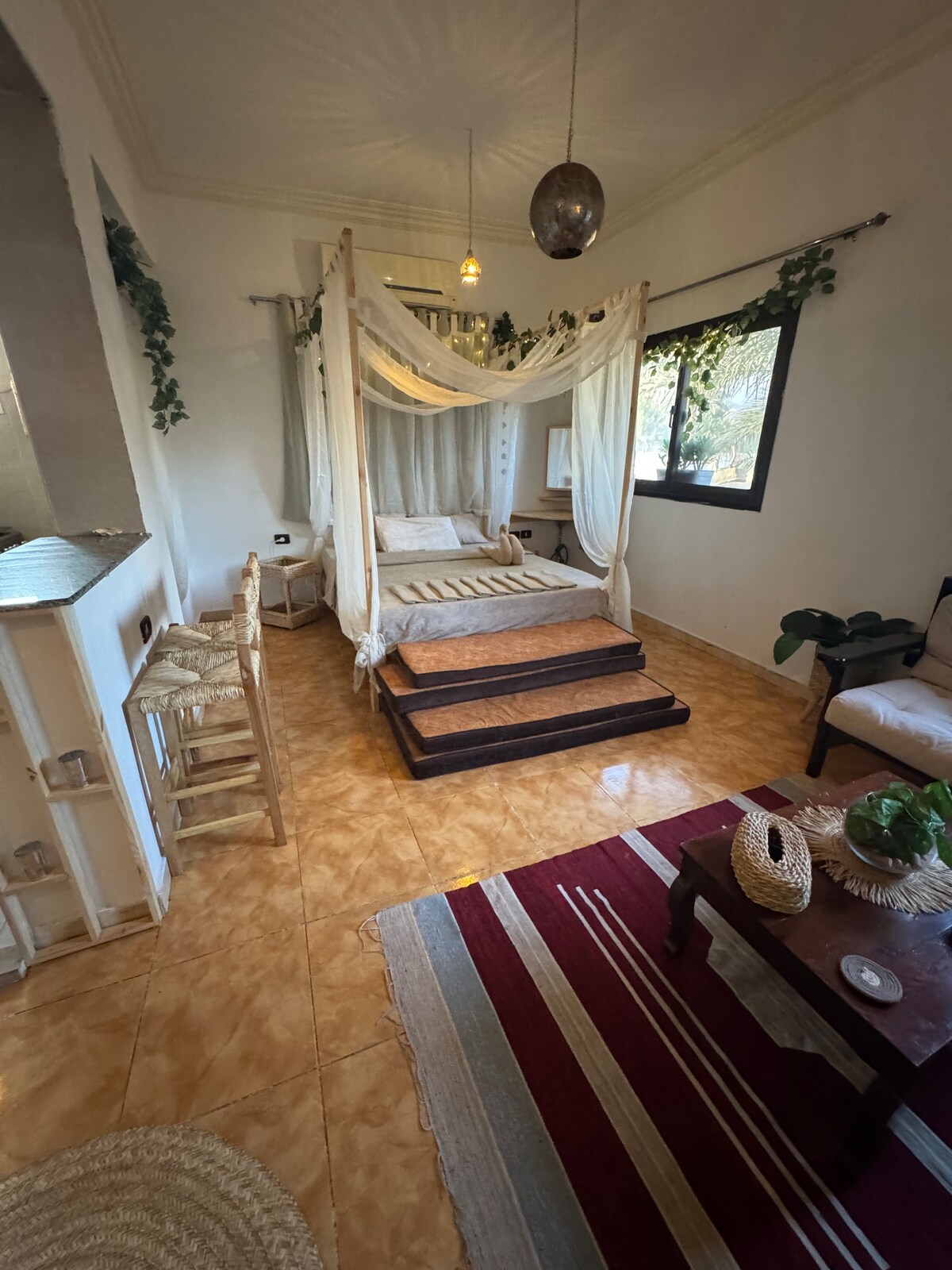Tucked away in a quiet local neighborhood, this hidden Dahab gem offers comfort and privacy with a true sense of retreat, while still being only an 8-minute walk from the lively Lighthouse area and the beach. Wake to the sound of roosters and enjoy your morning coffee in the garden. At sunset, head up to the rooftop for sweeping views of Sinai’s changing colors, then end the evening around the peaceful garden fire under a sky full of stars, with the city glowing in the distance.