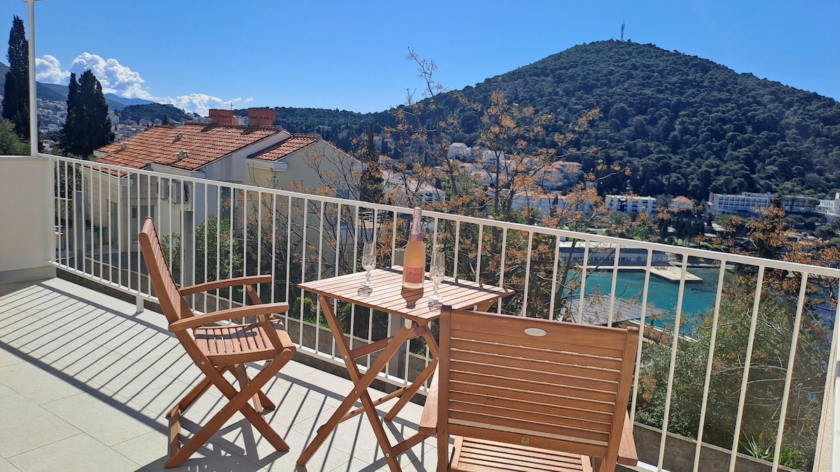 Enjoy in breathtaking sunset and sea view of Dubrovnik's coastline from your balcony. Surrounded by lush plants and trees this comfortable and spacious apartment is situated in a charming and quiet Lapad peninsula. The apartment is newly renovated and few steps away from pretty walks, small coves , pebbly and sandy beaches around the bay. Begin your day with swimming in the Adriatic and finish it with a spectacular sunsets over the islands.