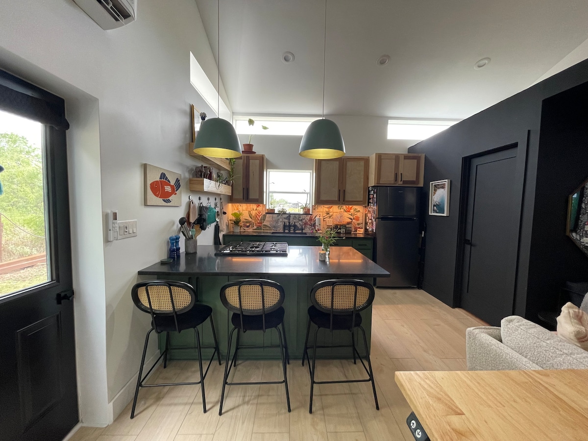 Welcome to Bluebonnet Trail! Come rest quietly in nature and enjoy all the amenities of an upscale hotel room and our unique design. Black Oak hosts a cozy queen size bed, a convenient kitchenette, and an elegant full bathroom with a soothing walk-in shower. Head upstairs to the rooftop deck to relax while stargazing or savoring your morning coffee, before heading out to play yard games and explore our walking trail. 12 minutes or less to Baylor, Magnolia Silos, Cameron Park and downtown Waco