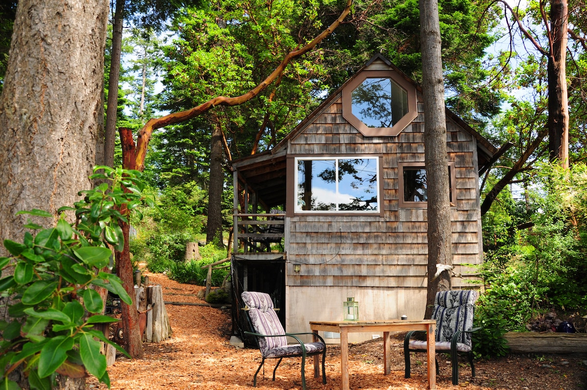 Unique fun space! if you are adventurous and want to crash at a very unique spot this is it. First floor has a mini fridge, smart TV, instant hot water kettle, coffee maker, bottled water, day bed with plenty of bedding in storage. Then you climb the ladder and go up to the tower. There is another single bed. Out the door is a private deck overlooking the San Juan Islands with a table and chairs. Take your coffee or wine out and enjoy the day. head back down take a dip in one of the hot tubs