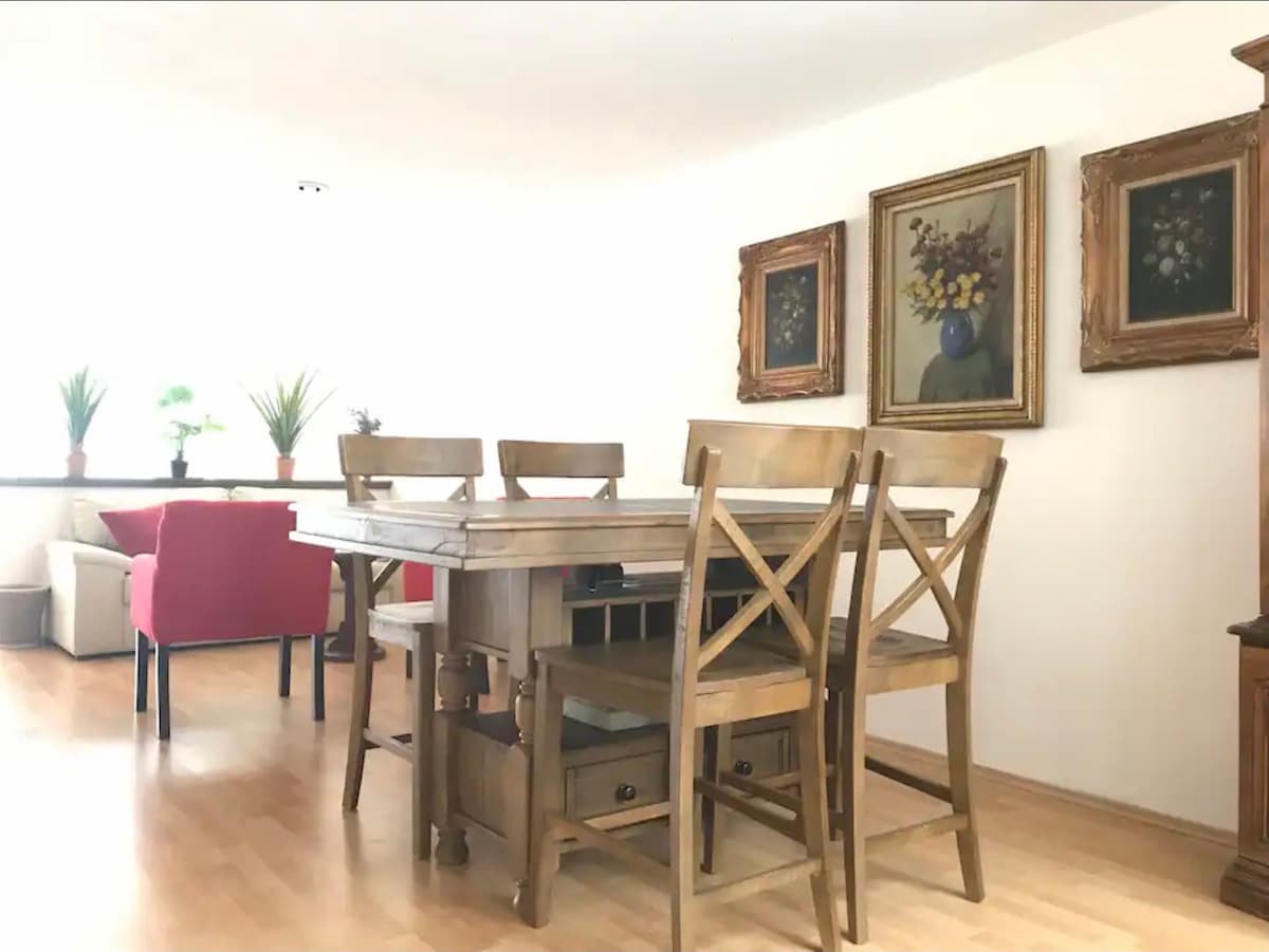Beautiful, unique and cozy are perfect words to describe this 2 bedroom apartment. The living room with tv & cable, the b&w bathroom and the main room share an amazing view… the foliage of the trees outside that creates a natural curtain making it fresh and relaxing. There’s a park half-block away. The kitchen is equipped and there’s a laundry room in case needed. It's centric so it's easy to plan any visit. Downtown, Polanco or Condesa/Roma are 25 mins away using any close MB or subway station.
