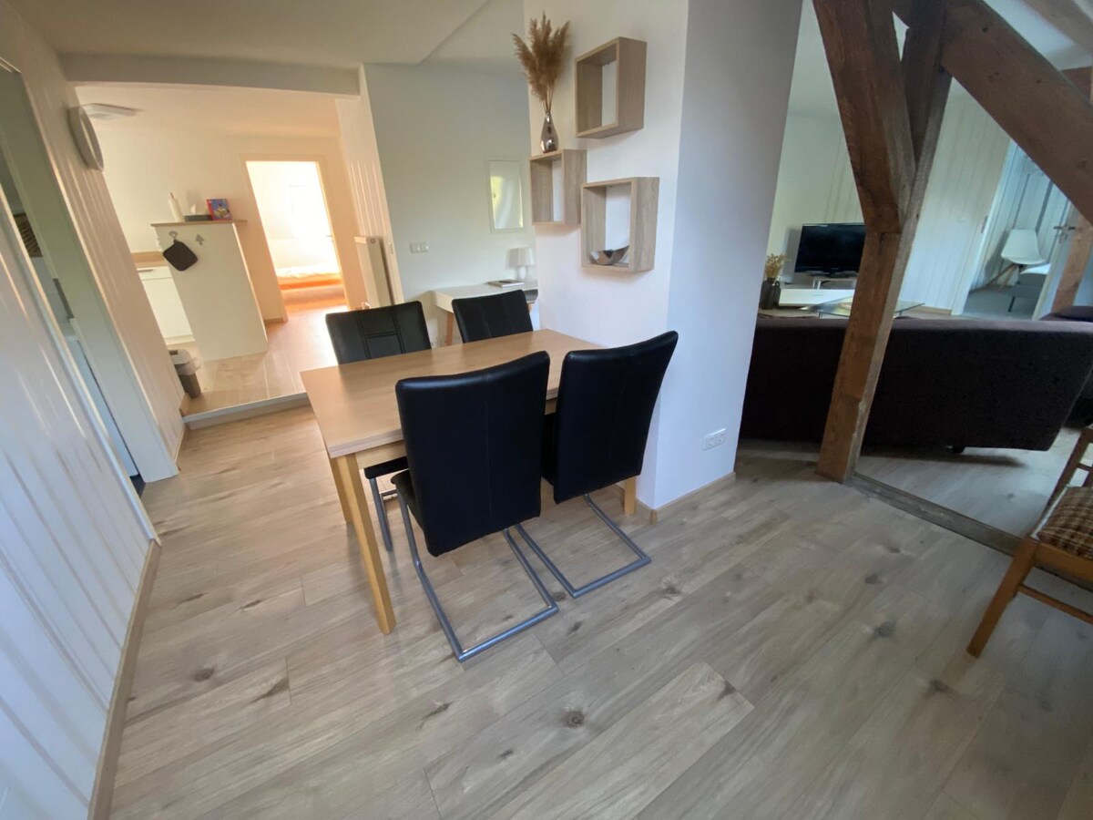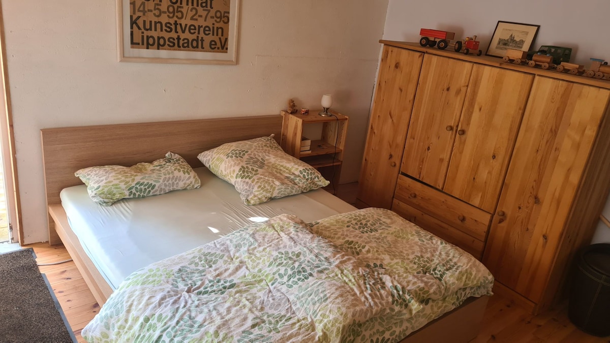 In a lovingly renovated, former horse stable from 1900, a cozy apartment awaits you in the middle of the countryside. You are very welcome to use the large garden. The apartment extends over two floors. On the ground floor is a large bedroom with double bed and crib. On the upper floor you will find the spacious living and dining area, another bedroom with two single beds, the kitchen and the bathroom. Two more mattresses are located in the cozy attic.